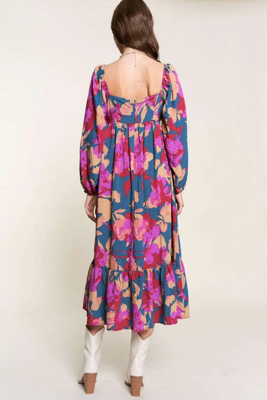 Multicolour Floral Print Square Neck Ruffled High Waist Dress