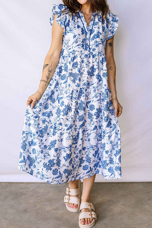 Blue Ruffled Short Sleeve Tiered Floral Midi Dress
