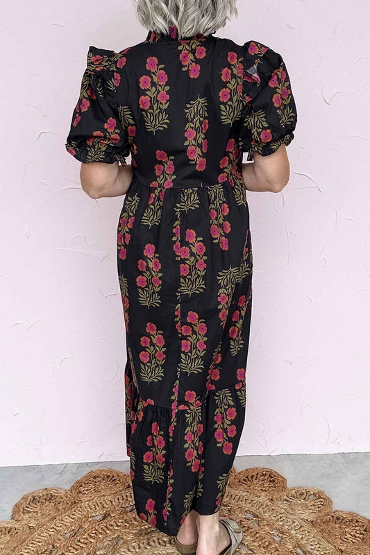 Black Floral Short Bubble Sleeve Tiered Maxi Dress