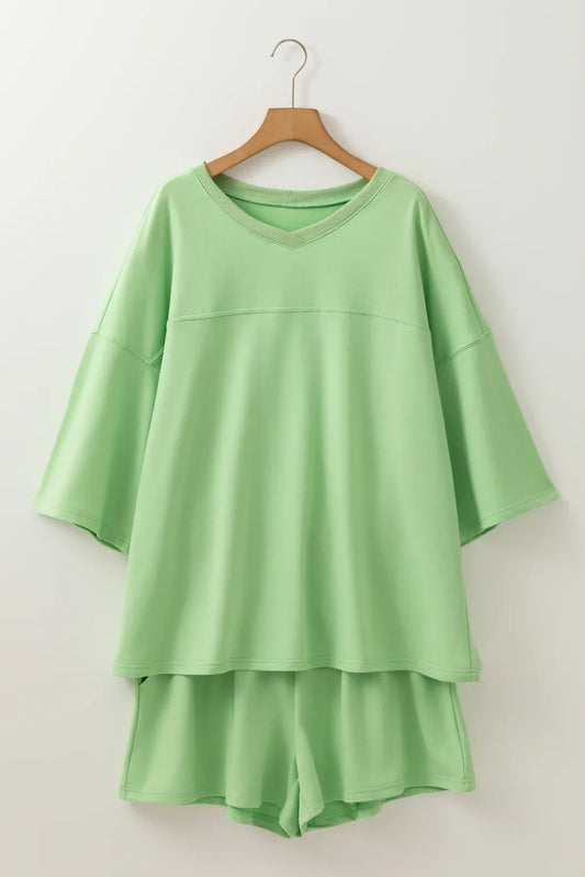Meadow Mist Green Plus Size V Neck Drop Shoulder Tee Loose Shorts 2pcs Outfit